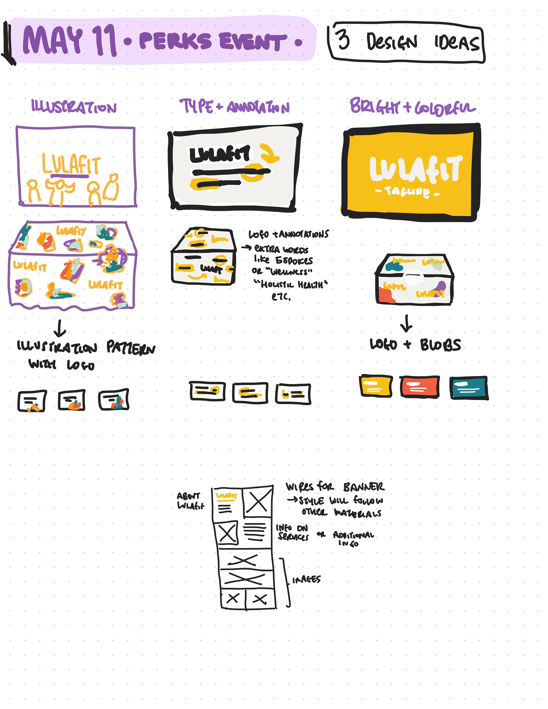 For an in-person conference, I concepted, designed, and produced various branded materials. The final design was selected from three concepts (shown in sketches below) with the intention to keep printed materials evergreen so they could be used in future applications. While the main focus was to inform visitors of Lulafit and the benefits of partnership, additional signage invited booth attendees to join Culture Lab (an HR-focused Slack group) and to register for an upcoming webinar series. During the event, a wellness activity was conducted where pain-points, problems, or worries were written on water-soluble paper that was then disolved in a bowl of water, symbolically representing letting those thoughts go.